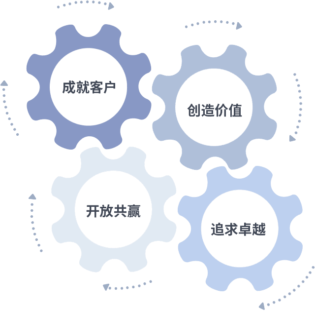 成就客户是一切决策的出发点,,,,创造价值是衡量所有工作的标准,,追求卓越是我们做事做人的态度,,开放共赢是我们的格局也是最终的结果。。。。价值观的齿轮环环相扣,,推动着组织里的每个人不断向前。。。